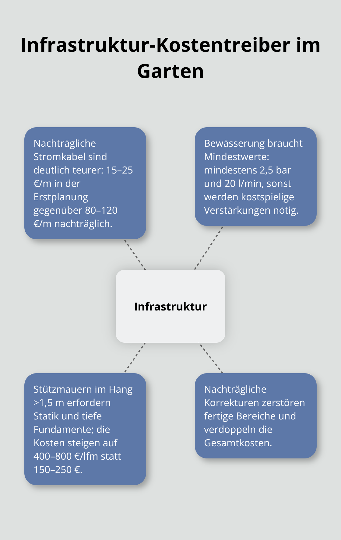 Besonders teuer wird es bei Hanggärten: Stützmauern über 1,5 Meter Höhe erfordern statische Berechnungen und Fundamente bis zu zwei Meter Tiefe. Diese Arbeiten kosten 400 bis 800 Euro pro Laufmeter statt ursprünglich kalkulierter 150 bis 250 Euro für einfache Trockenmauern. Nachträgliche Korrekturen an der Infrastruktur zerstören bereits fertiggestellte Bereiche und verdoppeln die Gesamtkosten.
